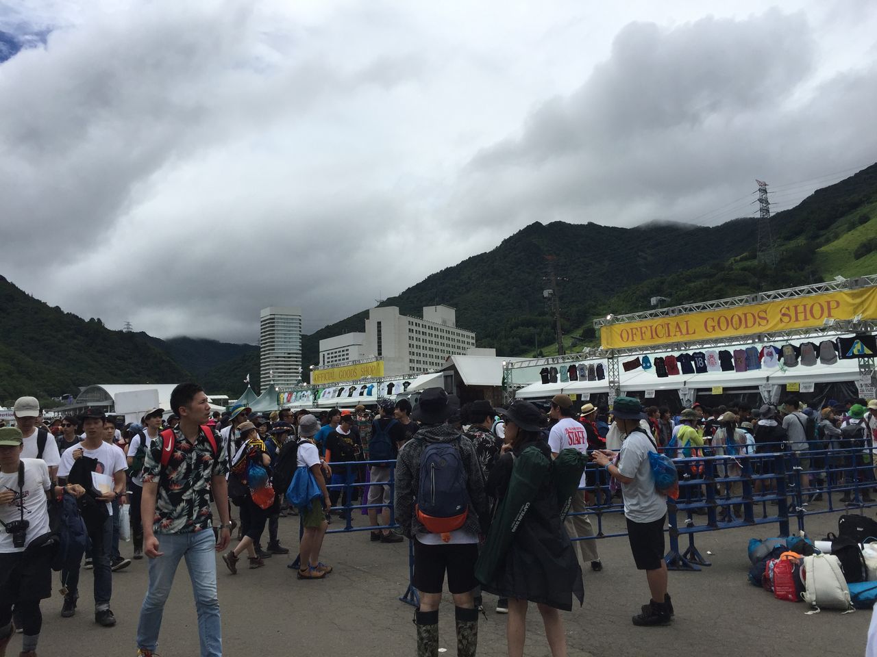 物販は会場内で行われていた。入るとピロウズの曲が流れている。「No Surrender」が特に印象的だった。物販スペースに入ると、レジが12列に渡って並び、壁にはメンバー3人の写真が飾られていた。天井からぶら下げられていたそれは、災害救助で活躍した市民の栄誉を称えるような、そんな趣だった。